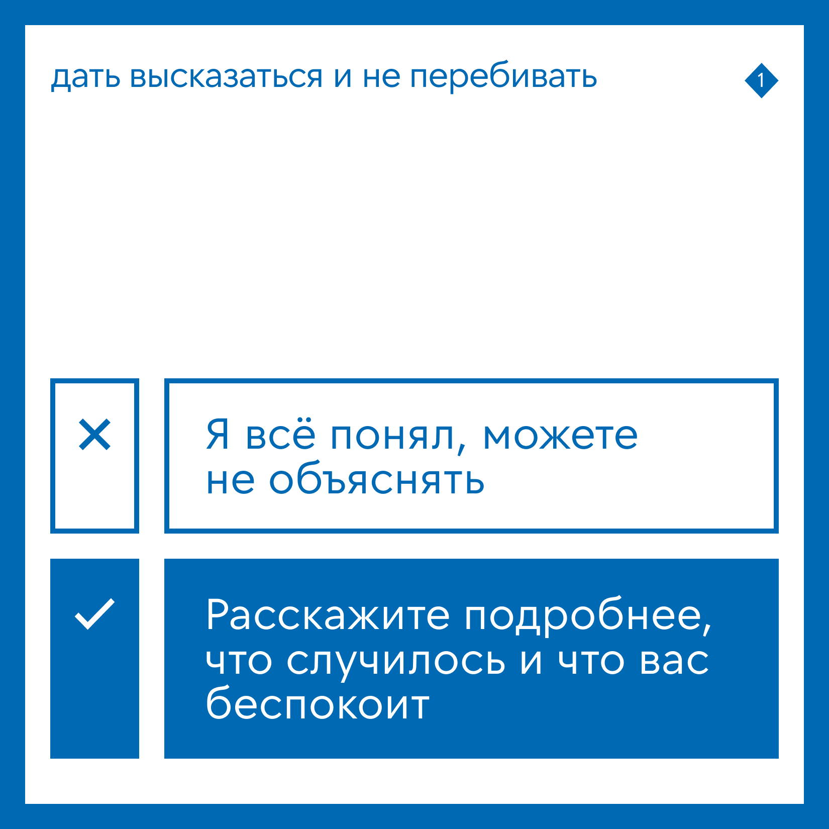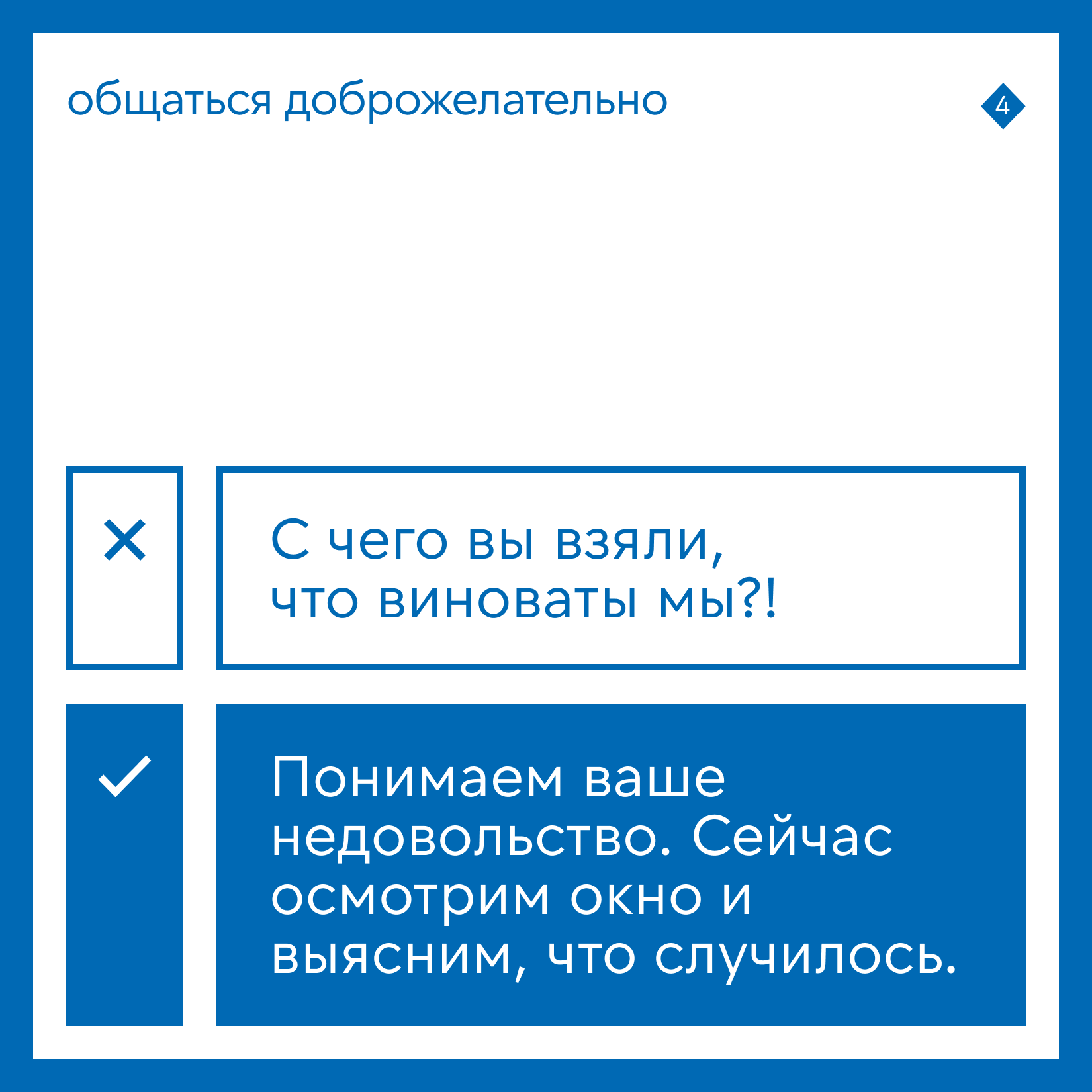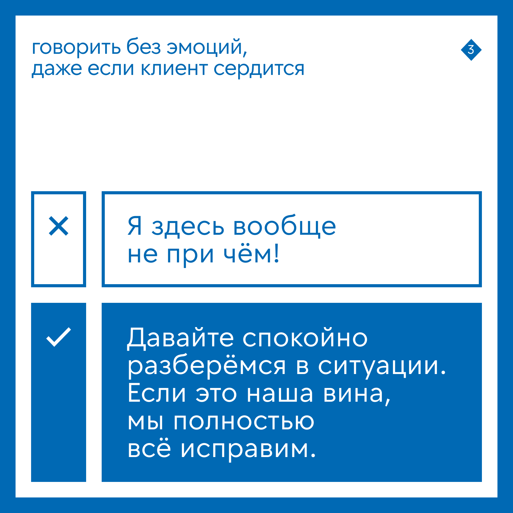 Говорить без эмоций, даже если клиент сердится. Помните, он недоволен не вами, а ситуацией. Профессионалу важно оставаться спокойным.