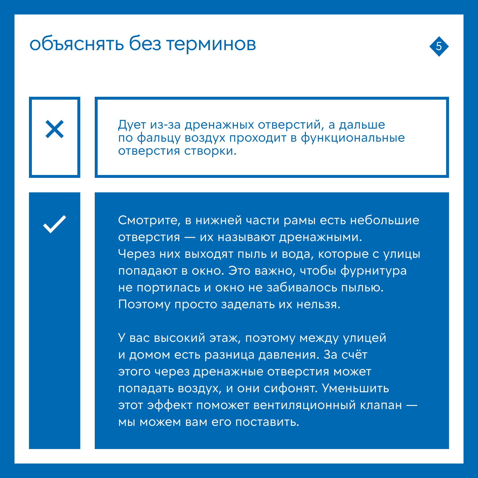 Как выглядит на практике Клиент: «Дует от петли и ручки». Монтажник: «Действительно, дует. Сейчас разберёмся, почему это происходит. У ручки и петель нет прямого выхода на улицу, поэтому через них воздух не может попасть в помещение. Сейчас всё проверим и решим проблему на месте или придумаем, что с этим можно сделать». |