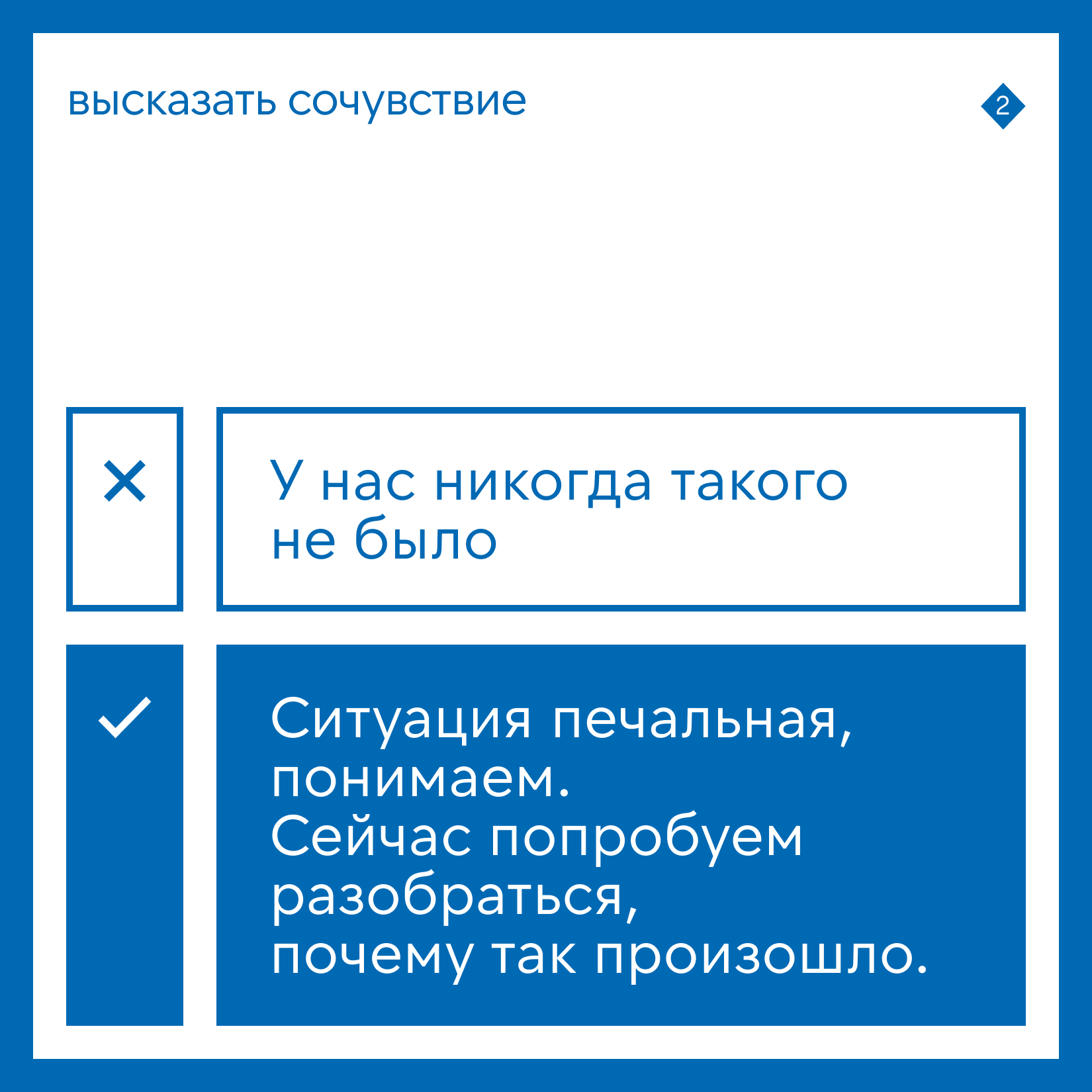 Высказать сочувствие. У клиента произошла неприятность: важно показать, что вам не всё равно. Даже если он виноват в ней сам — скорее всего, он об этом не подозревает.